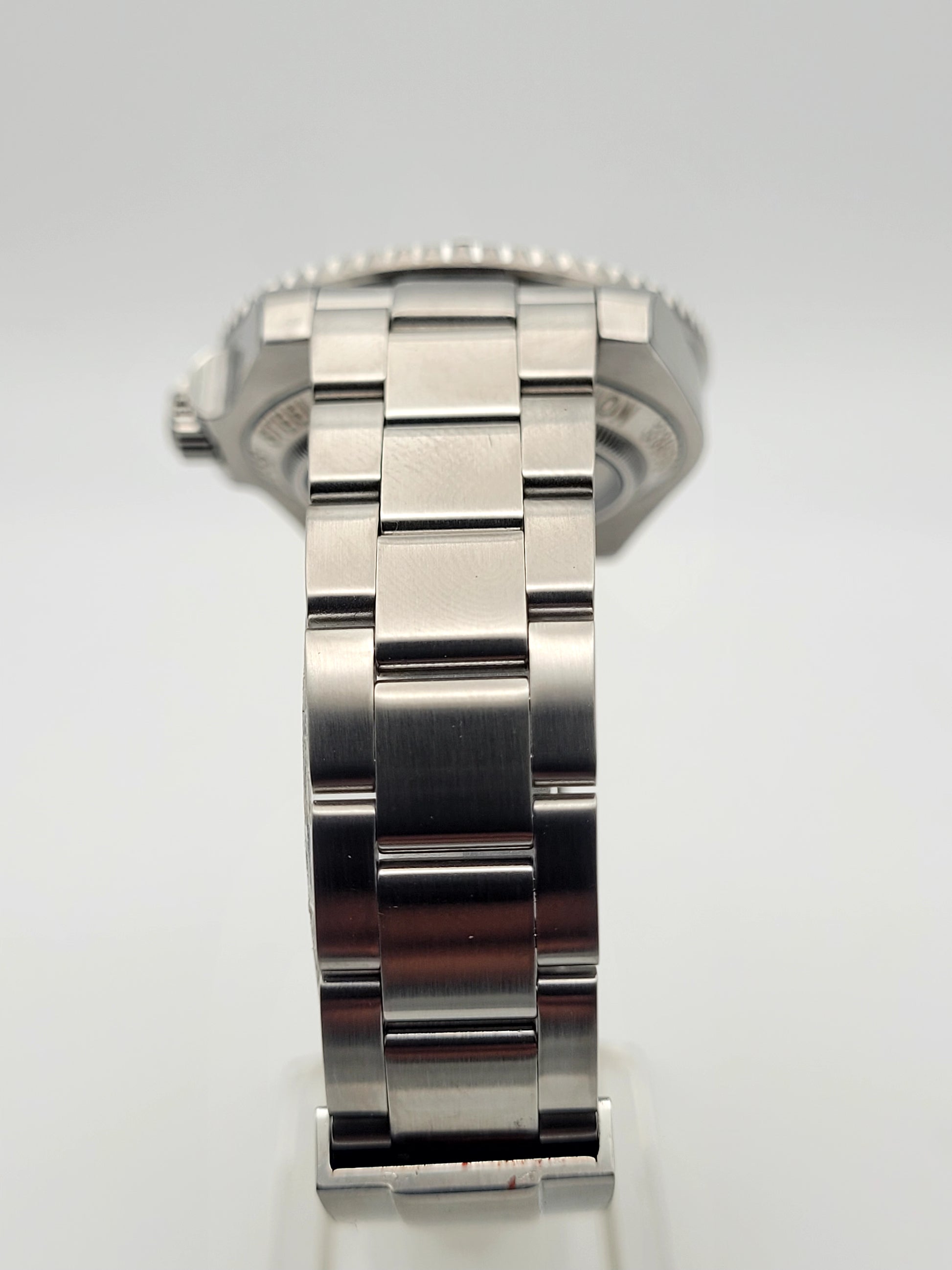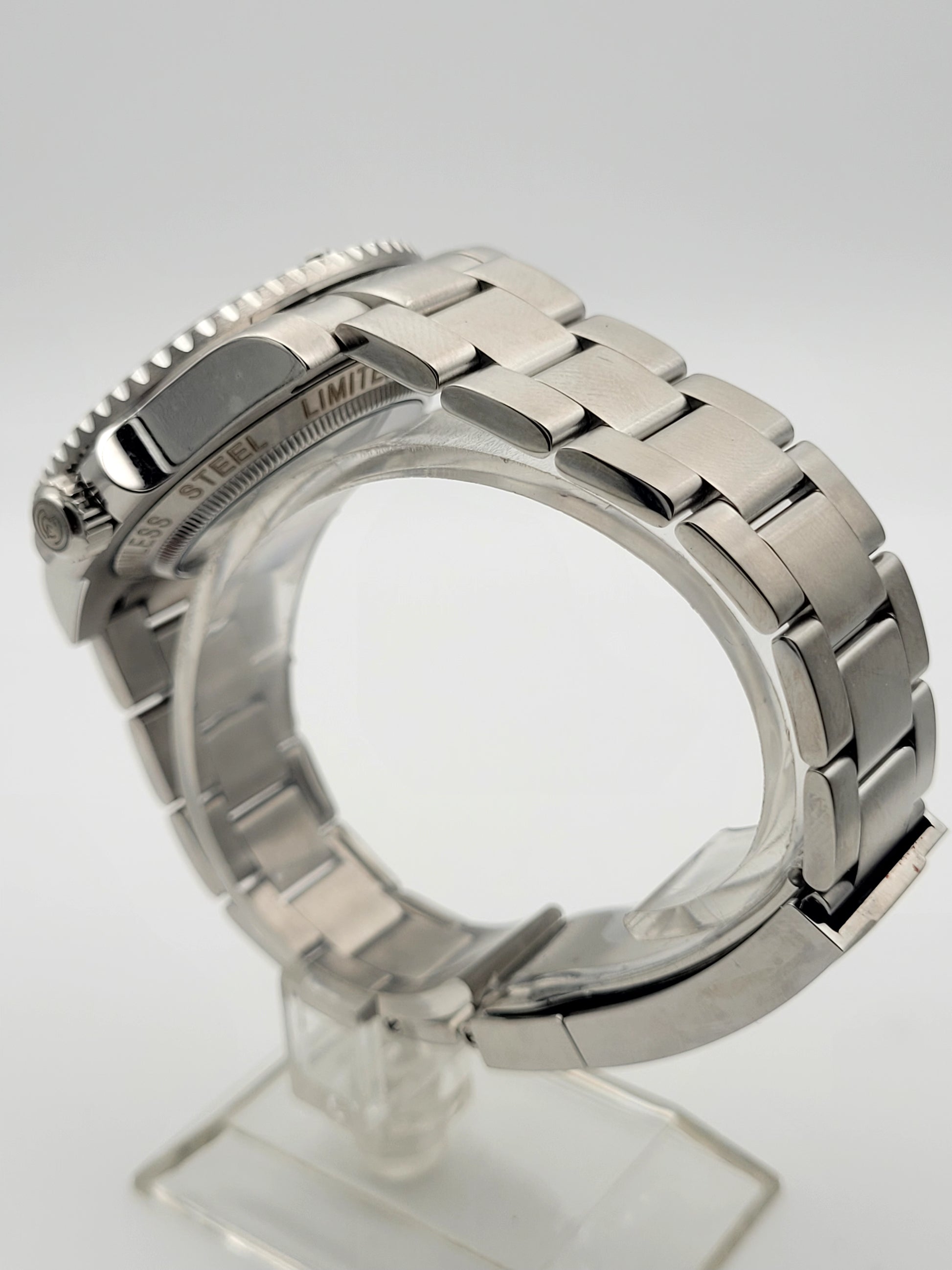 The Real Madrid Seiko TMI NH35 Auto Movt Watch is a stylish timepiece featuring a black dial, stainless steel strap and case, and a unidirectional rotating bezel. This customised watch is designed for both men and women, with a self-winding mechanical movement and water resistance up to 100m. With a sleek silver stainless steel bracelet band, this diver-style watch also boasts features such as a screwdown crown, date indicator, and scratch-resistant sapphire crystal. This watch comes in its original box and packaging, making it a perfect gift for fans of Real Madrid CF or watch enthusiasts alike.